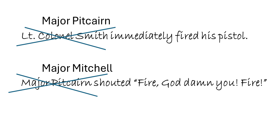 Is Mitchell’s senior rank subordinate only to Pitcairn, his status as a field officer, his threatening language, and his unique background as a dragoon captain enough to conclude he was the “Major Pitcairn” who ordered the British to fire on the Americans? The verdict, I suppose, depends on the jury.