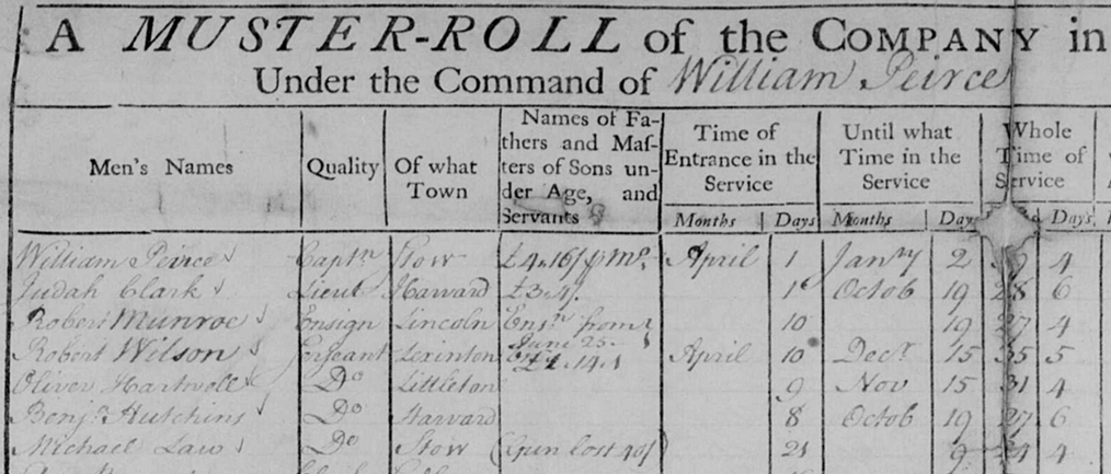 In addition to Robert Munro as ensign, the muster roll for Peirce’s company includes five men from “Lexinton”: a sergeant, Robert Wilson, and four private soldiers: “Benj Lock”, “Robin Raymont”, “Robert Wilson”, and “Henry Herrington.”