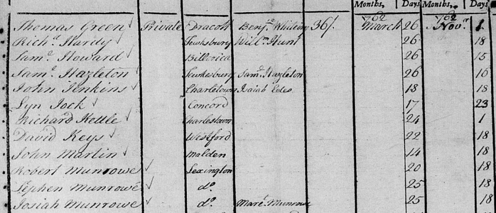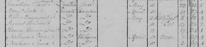 Cross-referencing these names with Hudson’s history reveals the following: Benjamin Lock was the 20-yr-old elder brother of Amos Lock (who fought 19 April 1775). Raymont was probably the colored servant “Robin” that Jonathan Raymond left to his wife Charity in his will. Robert Wilson was probably the son of the sergeant in the same company. Henry Harrington, likewise, was the 18-year-old son of a man by the same name.