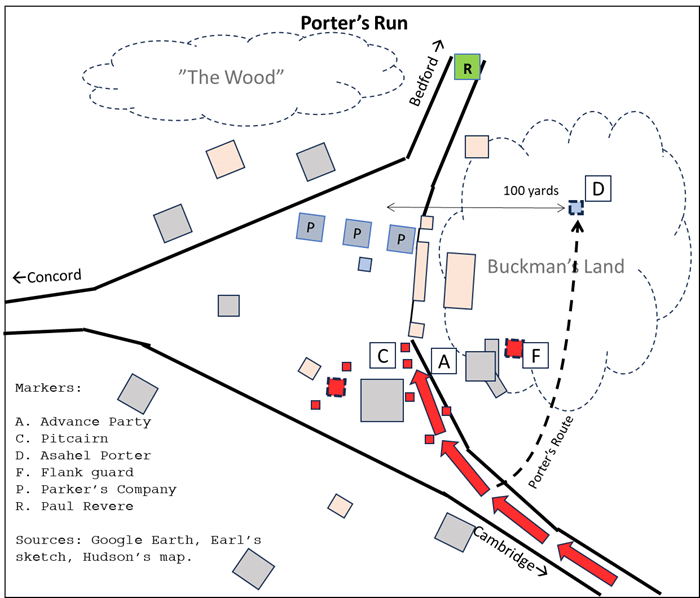 According to sources, Porter was shot and killed while running from the main column, either for attempting escape [Phinney, p36] or because he was mistaken for a British deserter [Dean, p9]. Either way, Porter’s path home would have taken him north of the road, straight past the flank guard. Cousins Amos and Ebenezer Lock found Porter shot about a hundred yards (twenty rods) from the common [Phinney, p38-9] as they approached from their Woburn homes to the north [Lock, p68-72].