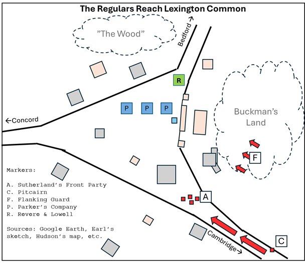 From Sutherland’s report [Murdock, p16], it seems clear that Major Pitcairn ordered flanking guards on both sides of the road and kept them there as they approached Lexington Common.