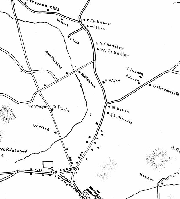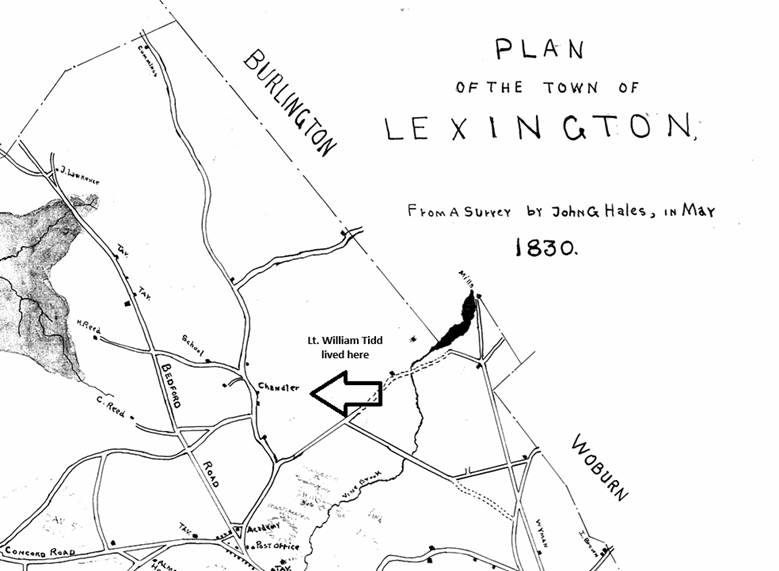 We can pin down Lt. William Tidd’s residence with greater certainty by working in the other direction. Hudson’s History (p42) says “The [1868] home of Mr. Nathan Chandler was originally a Tidd place.” This presumably means the Nathan Chandler living in 1868 whose father, Nathan Chandler Sr. had the same name.