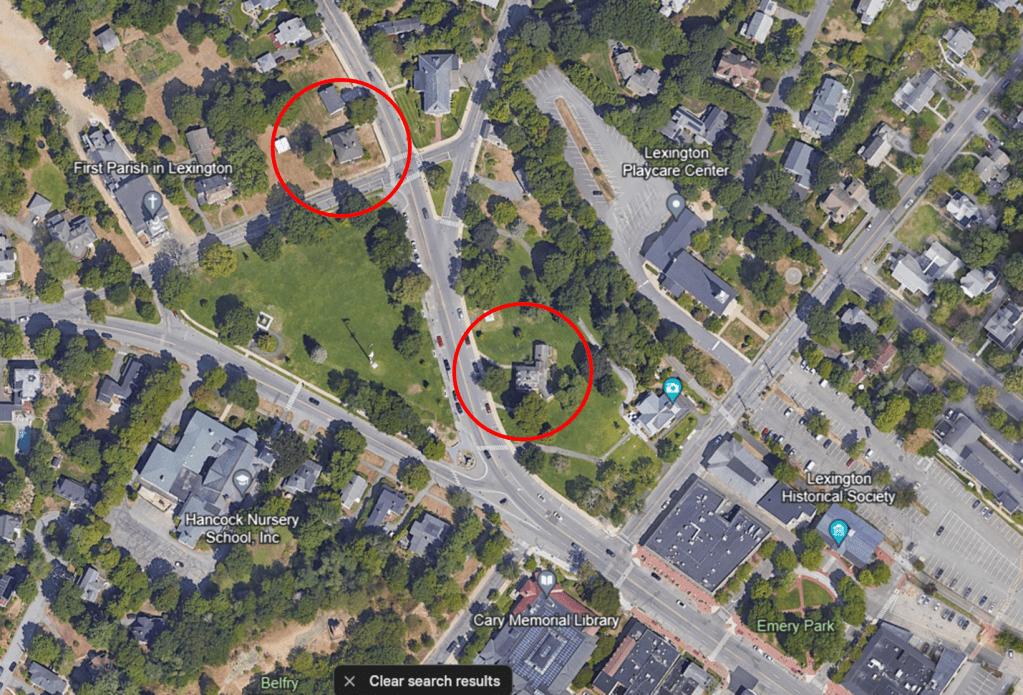 Google Earth provides the basic dimensions for the green. Jonathan Harrington’s house and Buckman Tavern still stand, supposedly in the same location as they did in 1775.