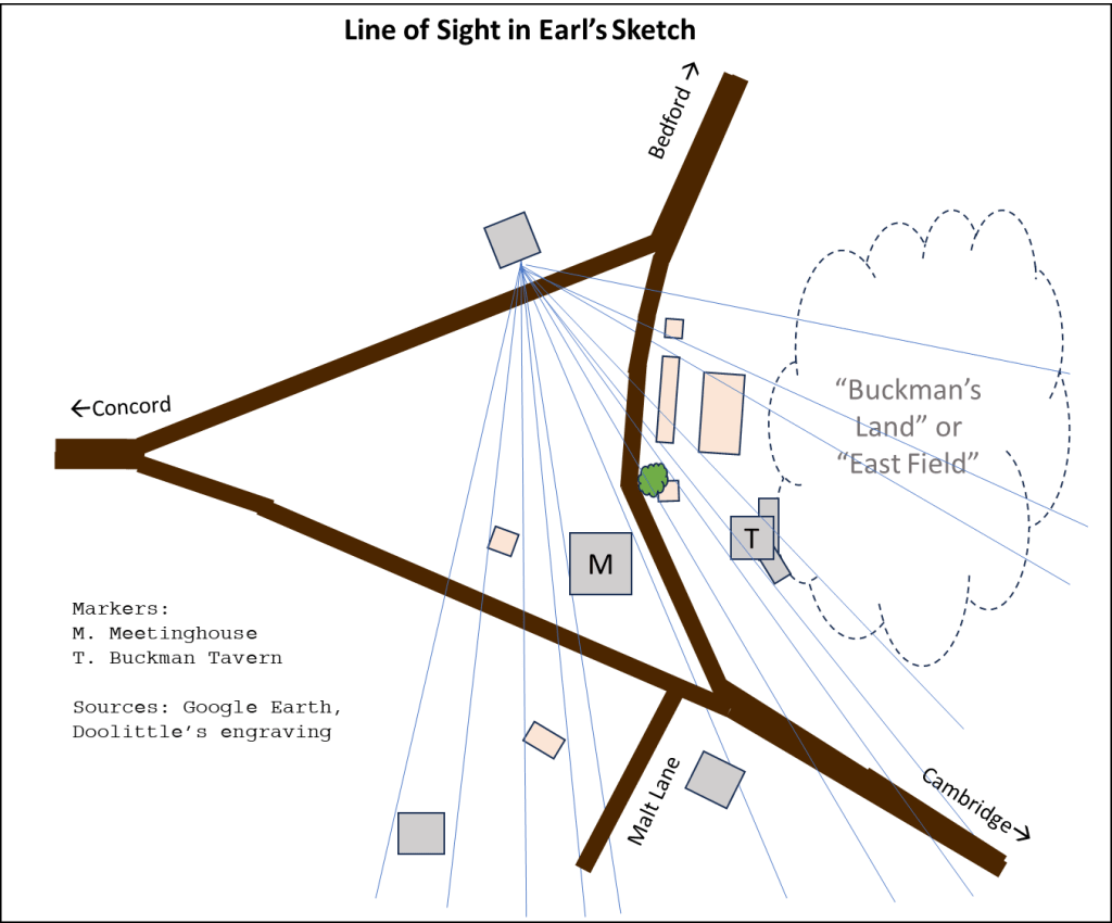 The perspective appears to be from Jonathan Harrington’s upstairs window. Since that building is one of the two still standing and the other–Buckman Tavern–is in view, we can use line of sight to place the structures around the common with some degree of accuracy.